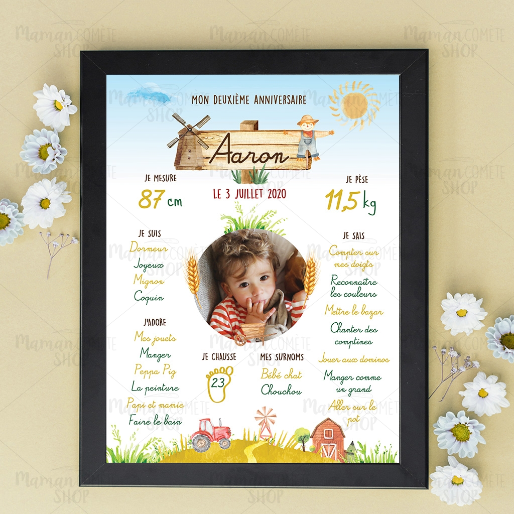 affiche_personnalisee-deuxieme-anniversaire-cadre-bois-idee-cadeau-offrir-bebe-champs-tracteur-blé-3