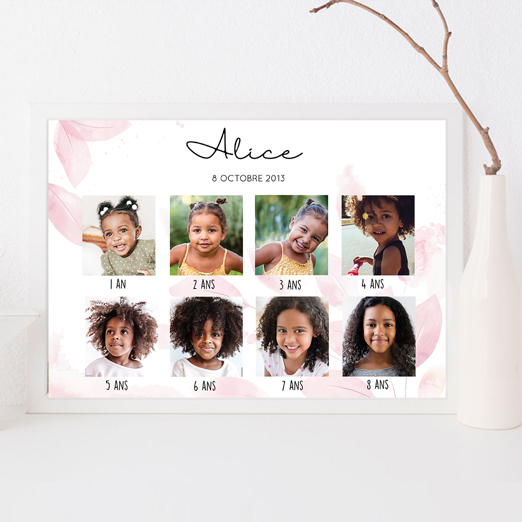 affiche_évolution_personnalisée_photos_enfants_années_anniversaire_changement_un_an_8_ans_cadre_blanc