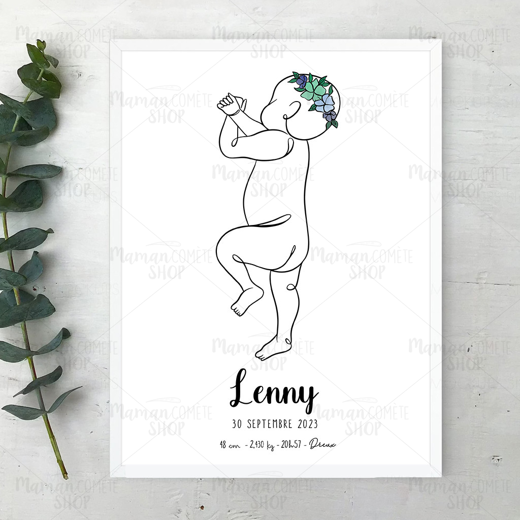 Affiche_naissance_bébé_ligne_cadeau_fleurs_Cadre_Blanc