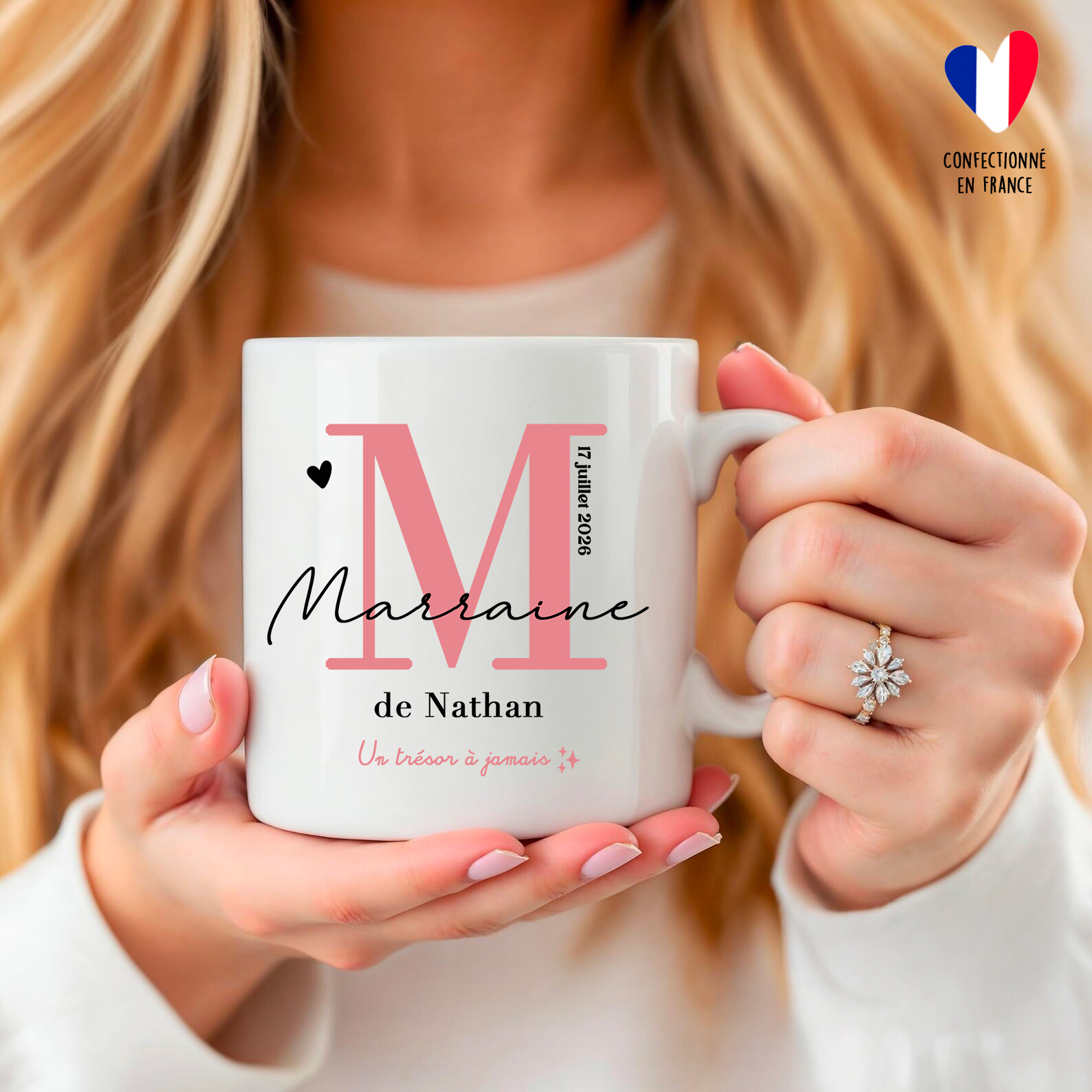 Mug personnalisé Marraine – prénom, date, coeur | Cadeau unique souvenir