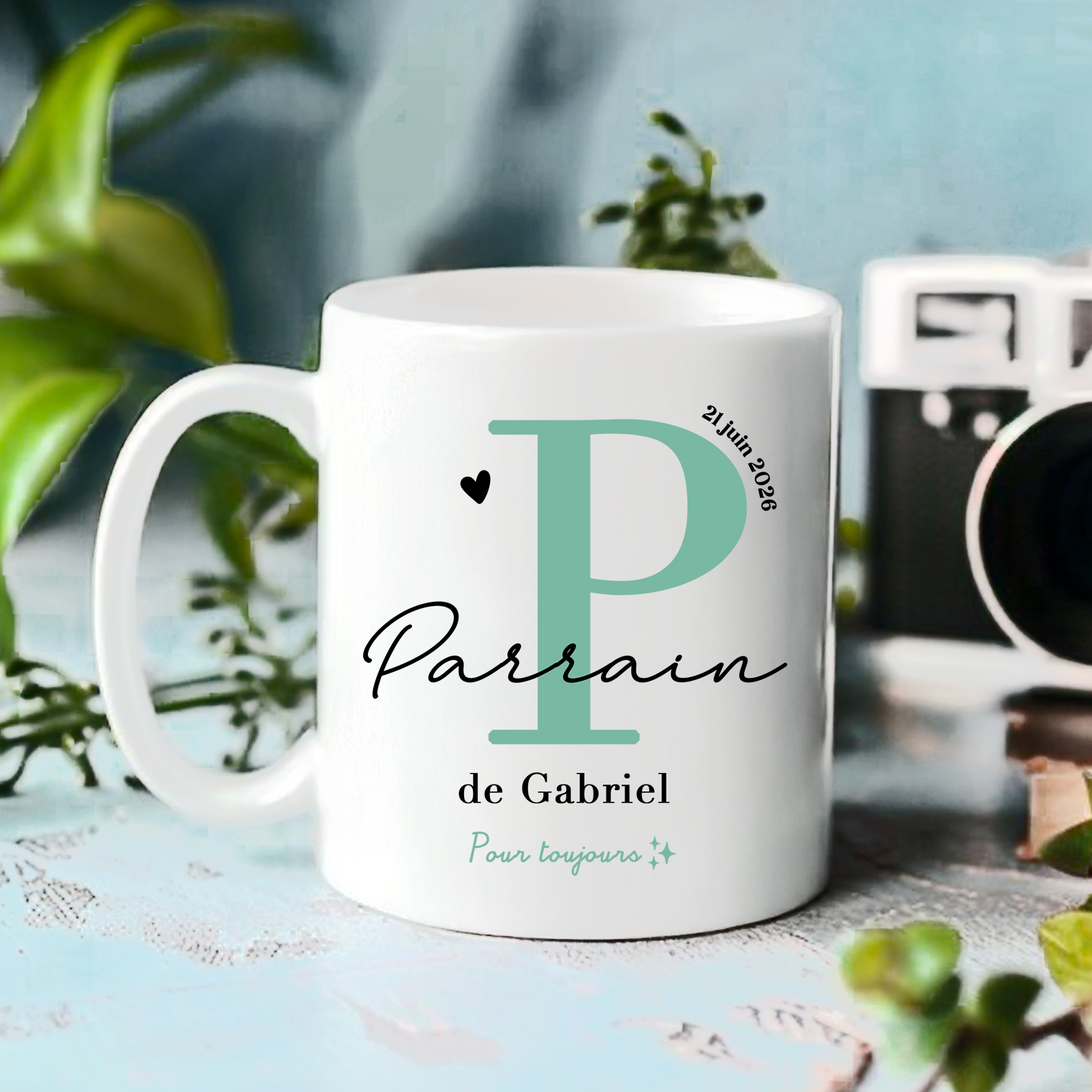 Mug personnalisé Parrain – prénom, date, coeur | Cadeau unique souvenir