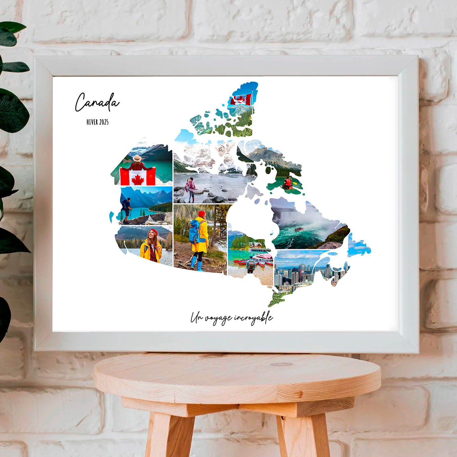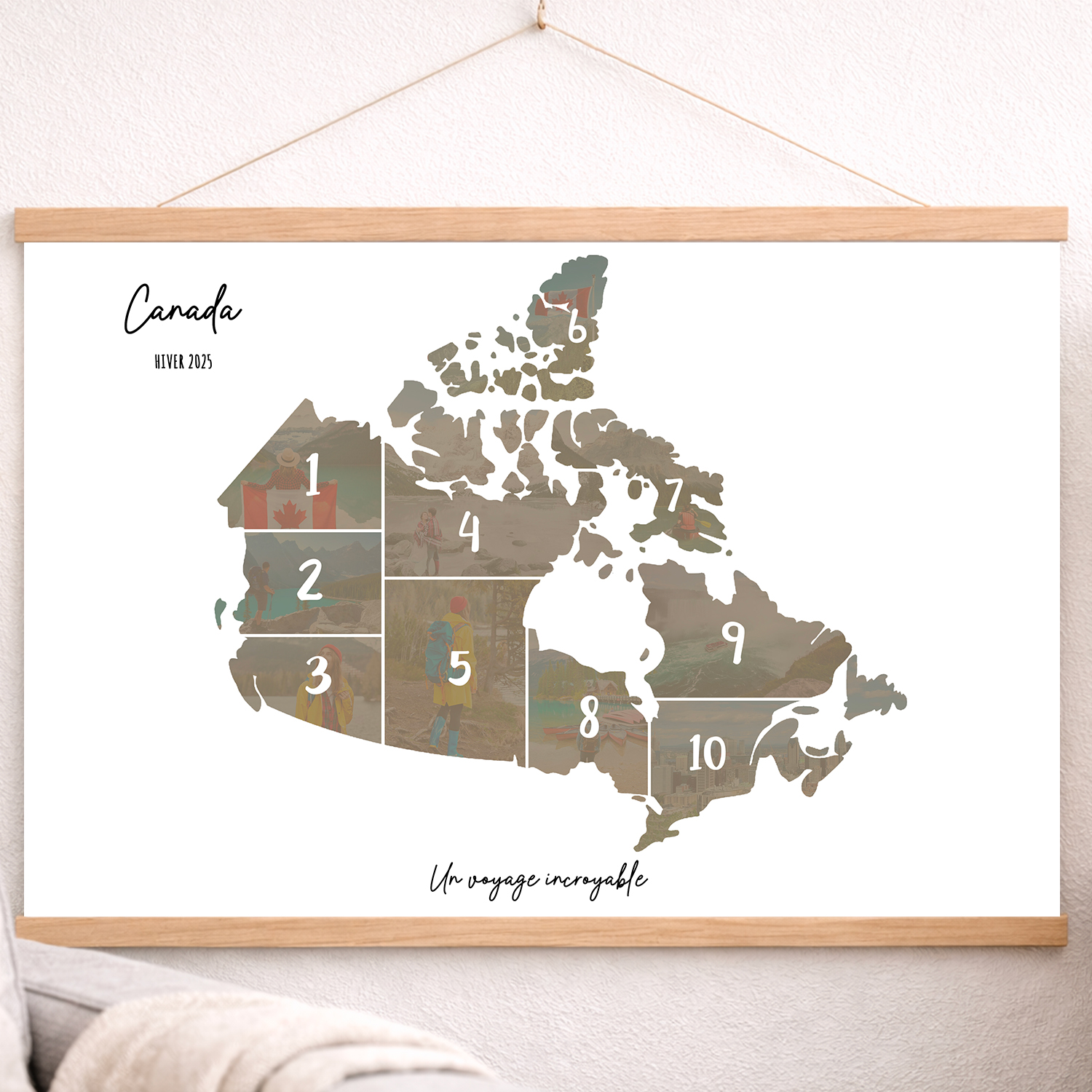 Idéale pour décorer votre maison ou offrir en cadeau, cette affiche met en valeur les moments inoubliables de votre séjour sur ce pays magnifique. Personnalisez facilement en ligne et commandez dès aujourd’hui pour revivre vos aventures canadiennes à chaque regard !