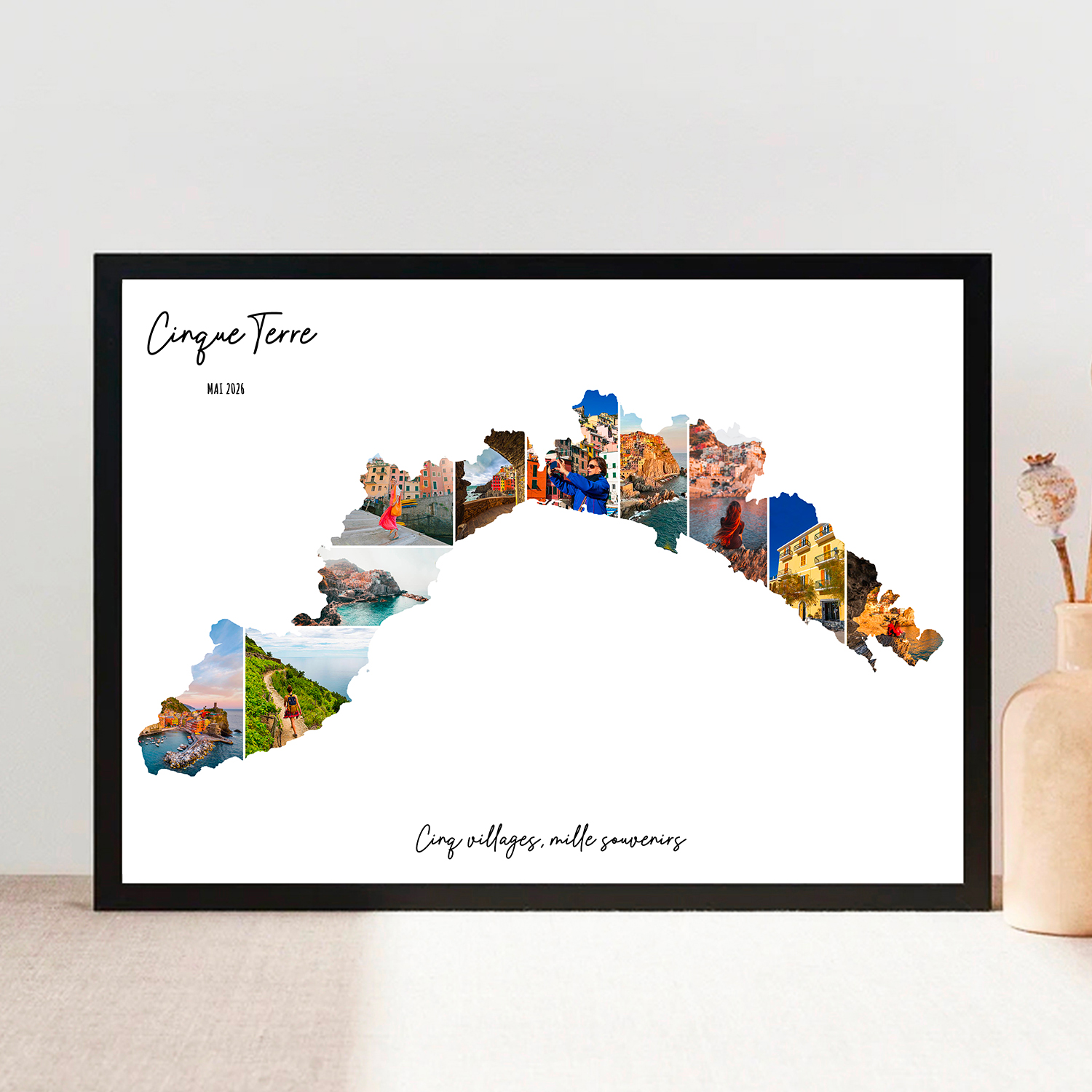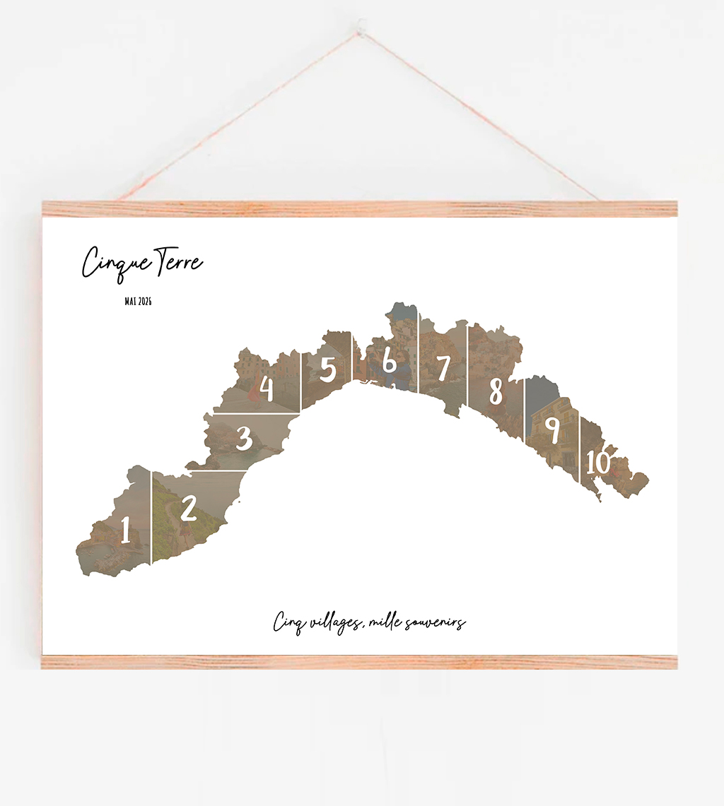 Transformez vos souvenirs de vacances aux Cinque Terre en Italie en une œuvre d’art unique grâce à notre affiche personnalisée en collage photo. Cette création originale intègre vos 10 photos préférées dans la silhouette de la carte des Cinq Terre, pour créer un souvenir visuel à la fois captivant et élégant.