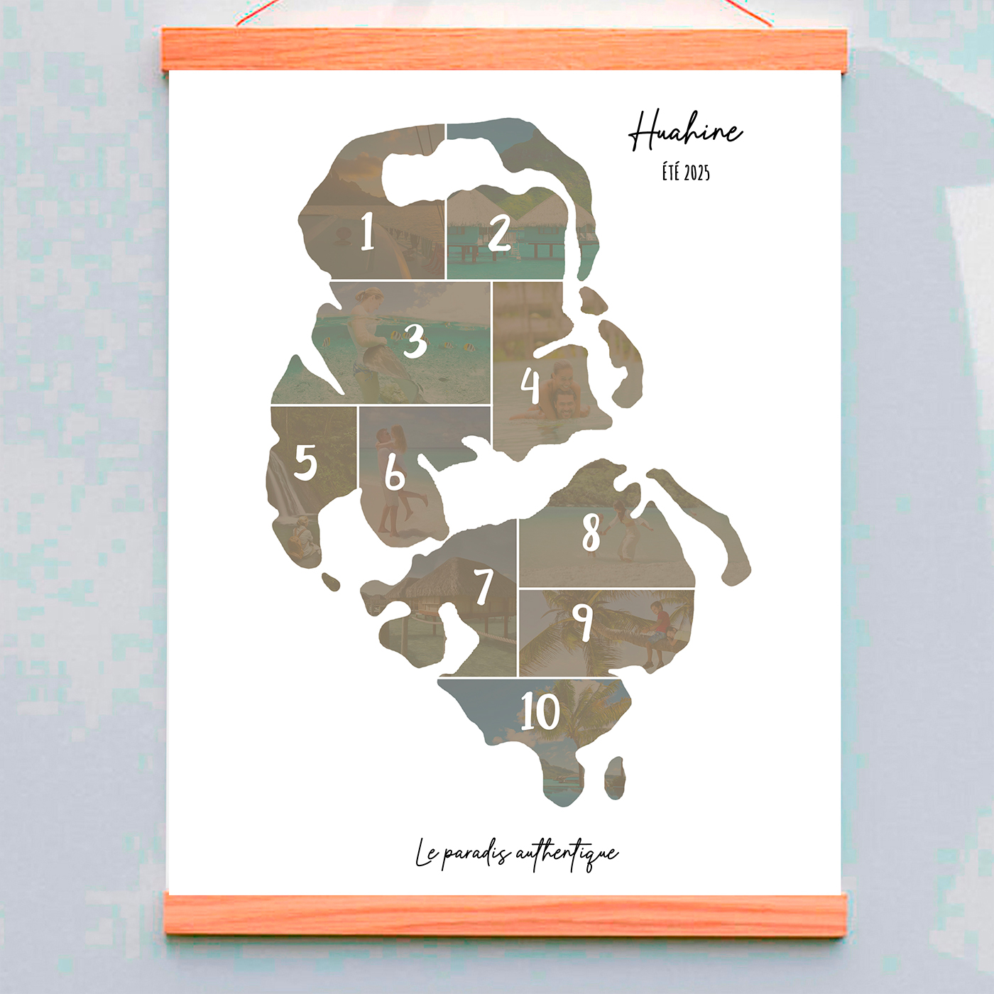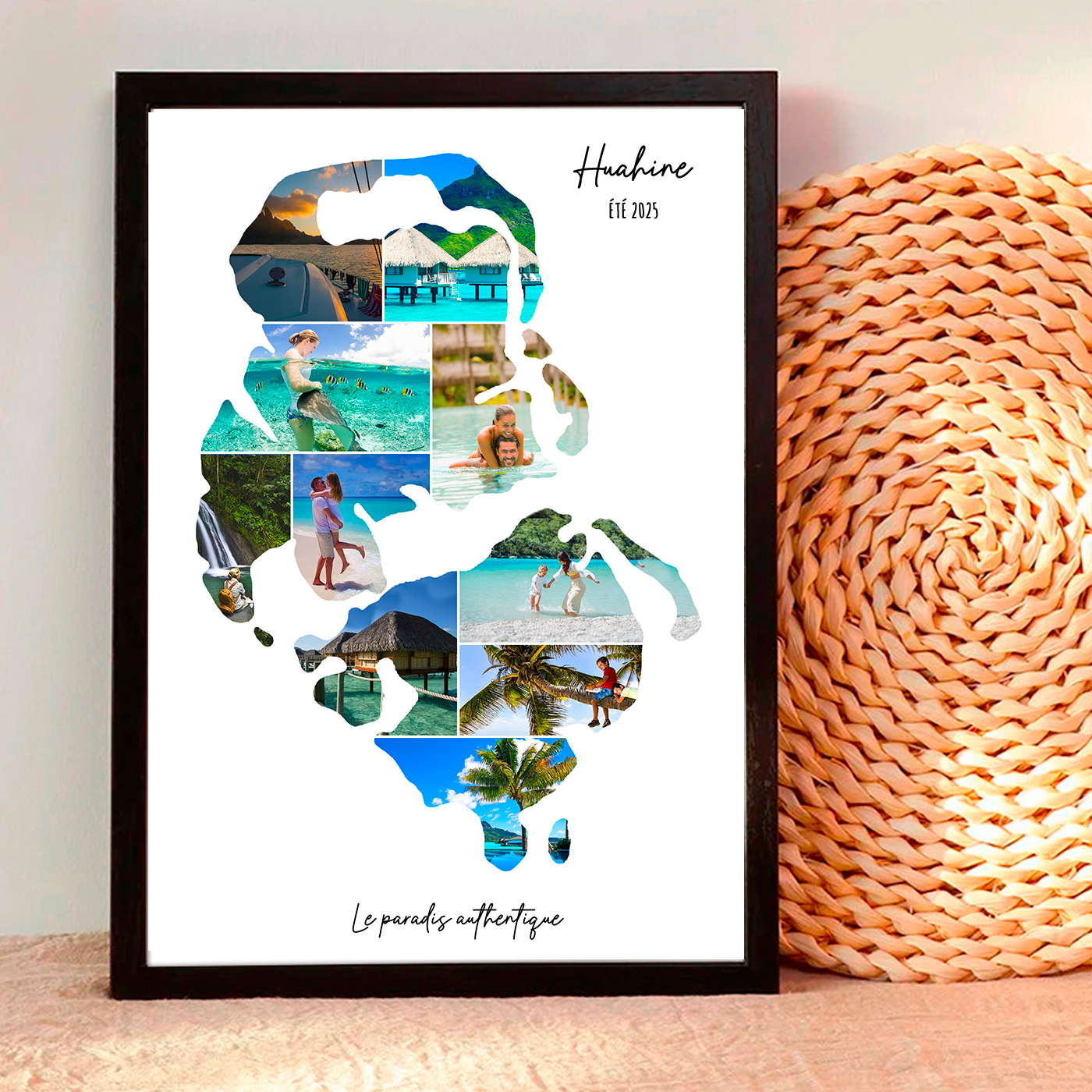 Transformez vos souvenirs de vacances à Huahine, une île de Polynésie en une œuvre d’art unique avec notre affiche personnalisée de collage photo. Cette affiche innovante intègre vos 10 photos préférées dans la silhouette de la carte de l’île de Huahine, créant un souvenir visuel captivant et élégant.
