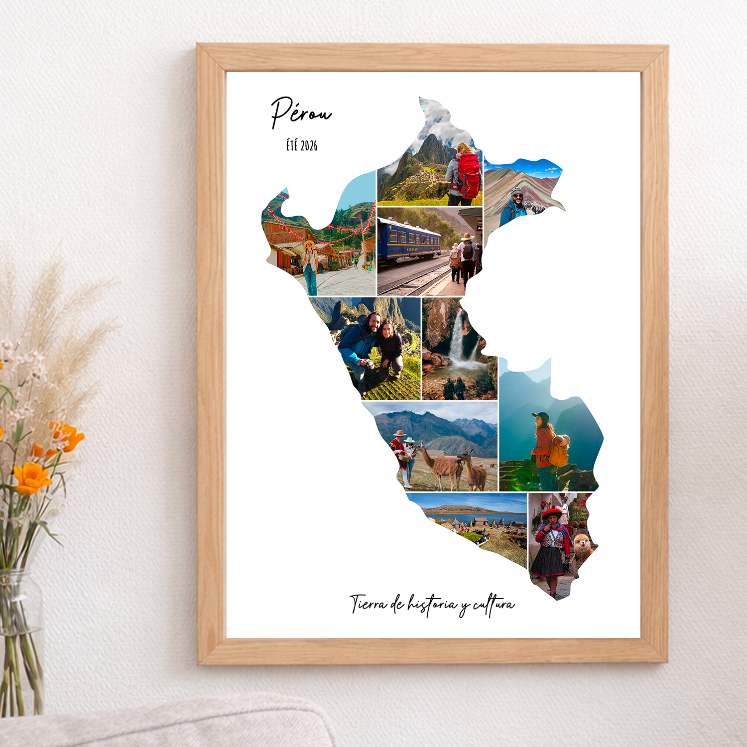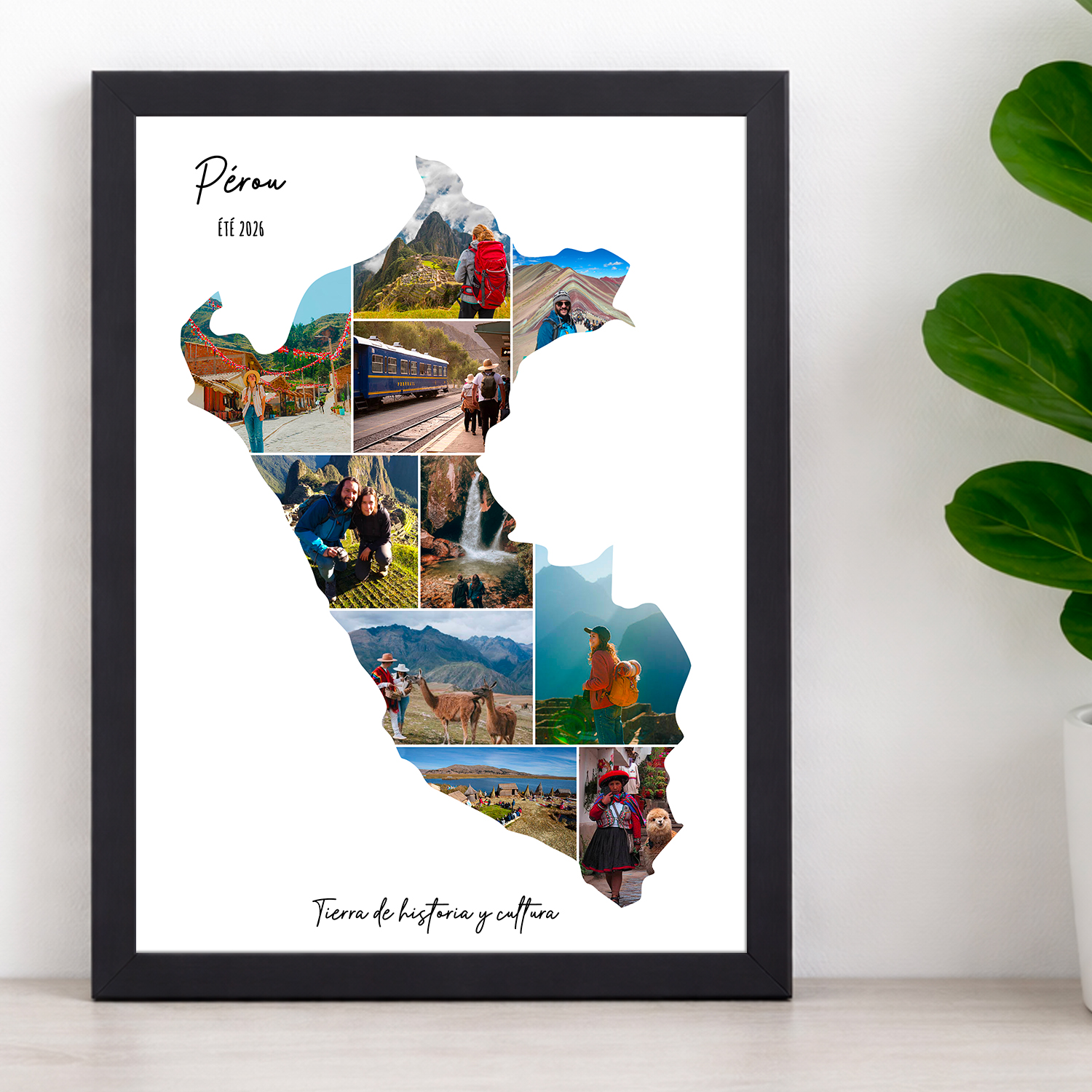 Transformez vos souvenirs de vacances au Pérou en une œuvre d’art unique grâce à notre affiche personnalisée en collage photo. Cette création originale intègre vos 10 photos préférées dans la silhouette de la carte du Pérou, pour créer un souvenir visuel à la fois captivant et élégant.