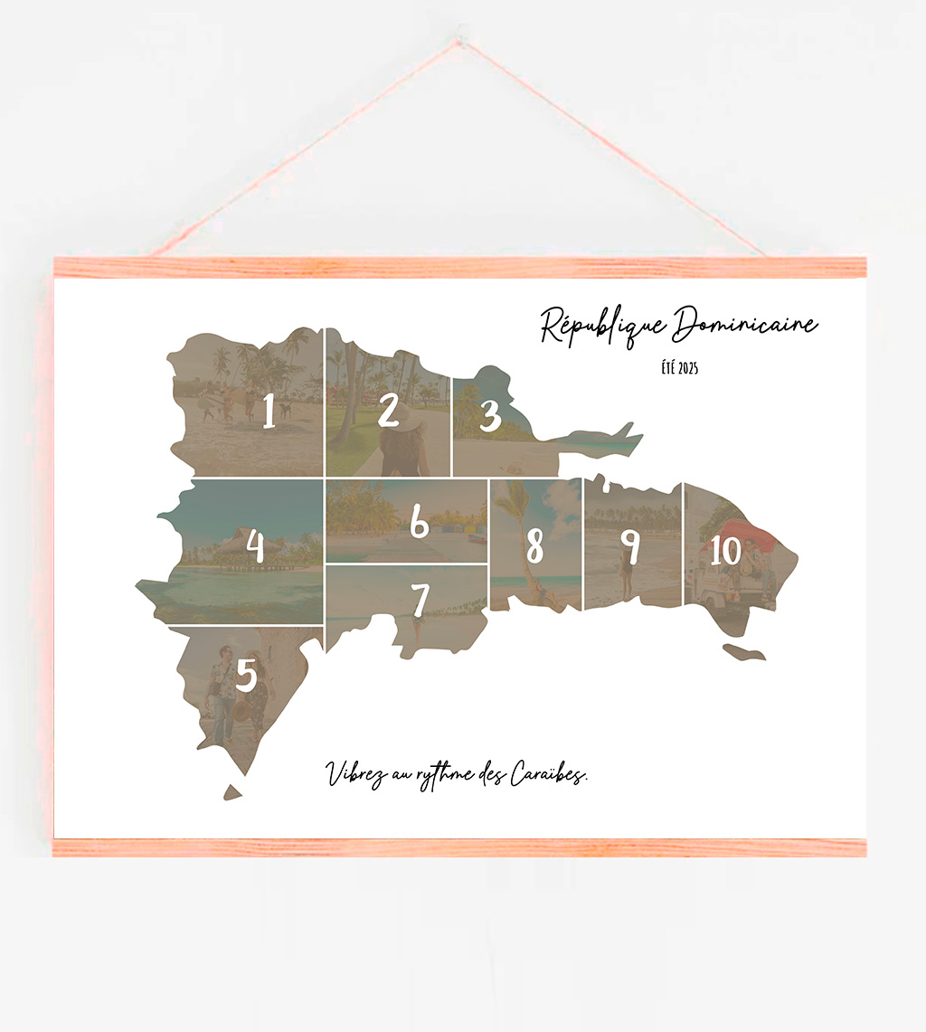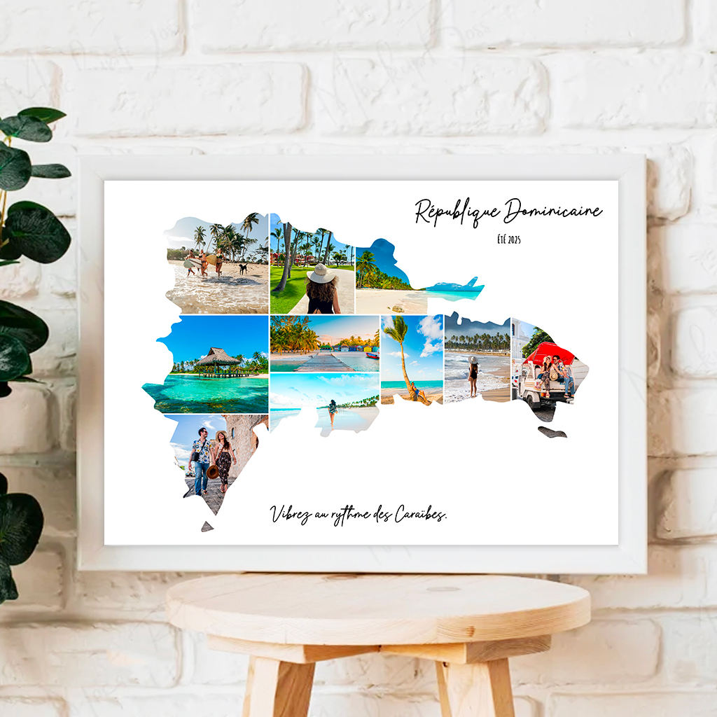 Transformez vos souvenirs de vacances en République Dominicaine en une œuvre d’art unique avec notre affiche personnalisée de collage photo. Cette affiche innovante intègre vos 10 photos préférées dans la silhouette de la carte de l’île de Bora Bora, créant un souvenir visuel captivant et élégant.