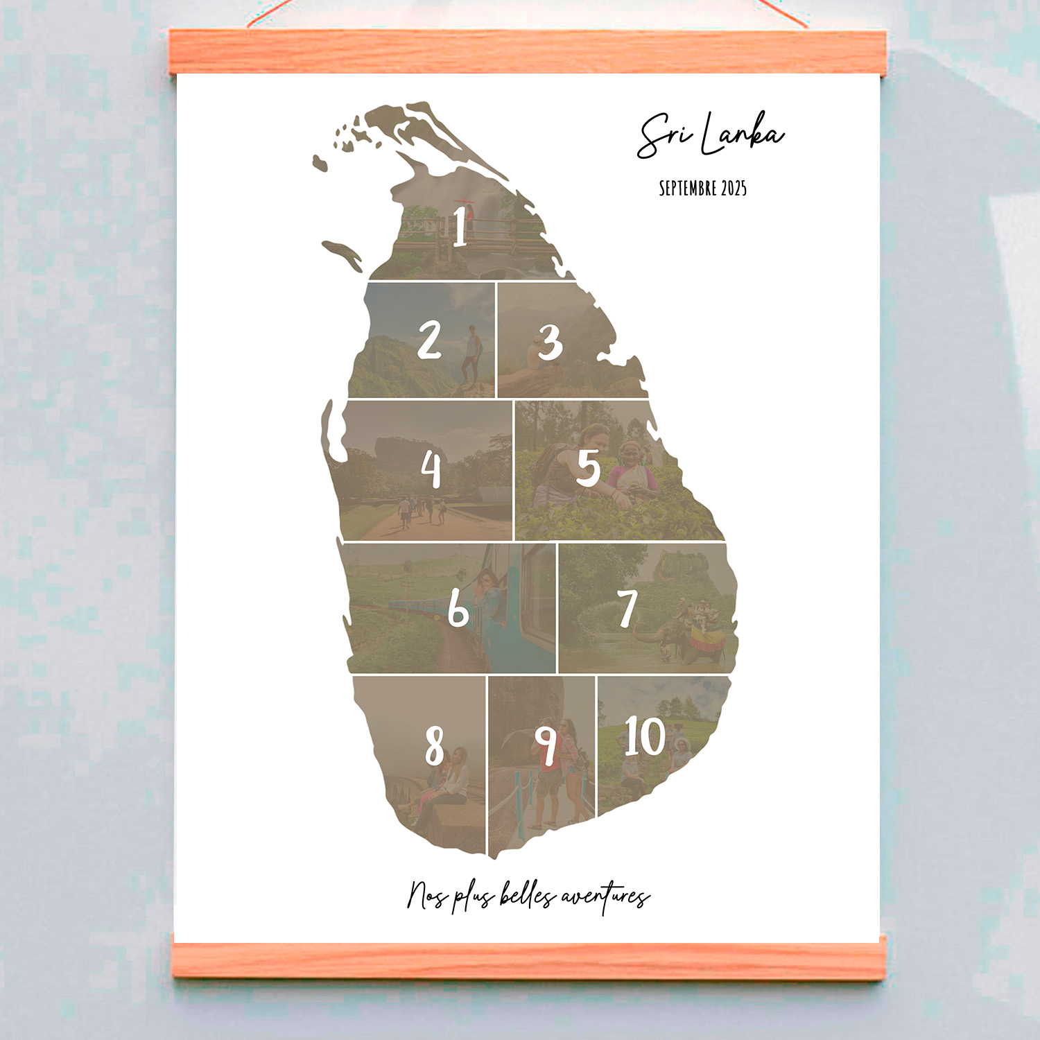 Cette création originale rassemble vos 10 photos préférées dans la silhouette de la carte du Sri Lanka, pour un souvenir visuel à la fois élégant et plein d’émotions.