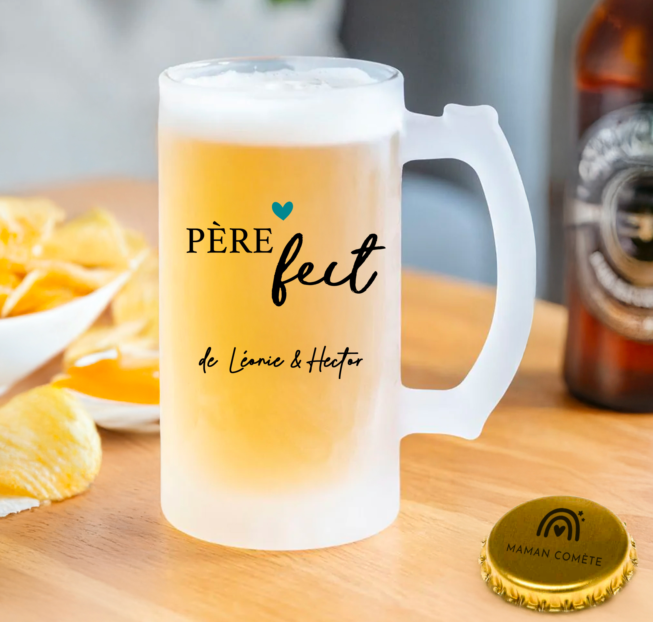 Offrez une pause bien méritée à un papa “Père-fect” avec cette chope à bière personnalisée, à la fois élégante et pleine de tendresse 💙