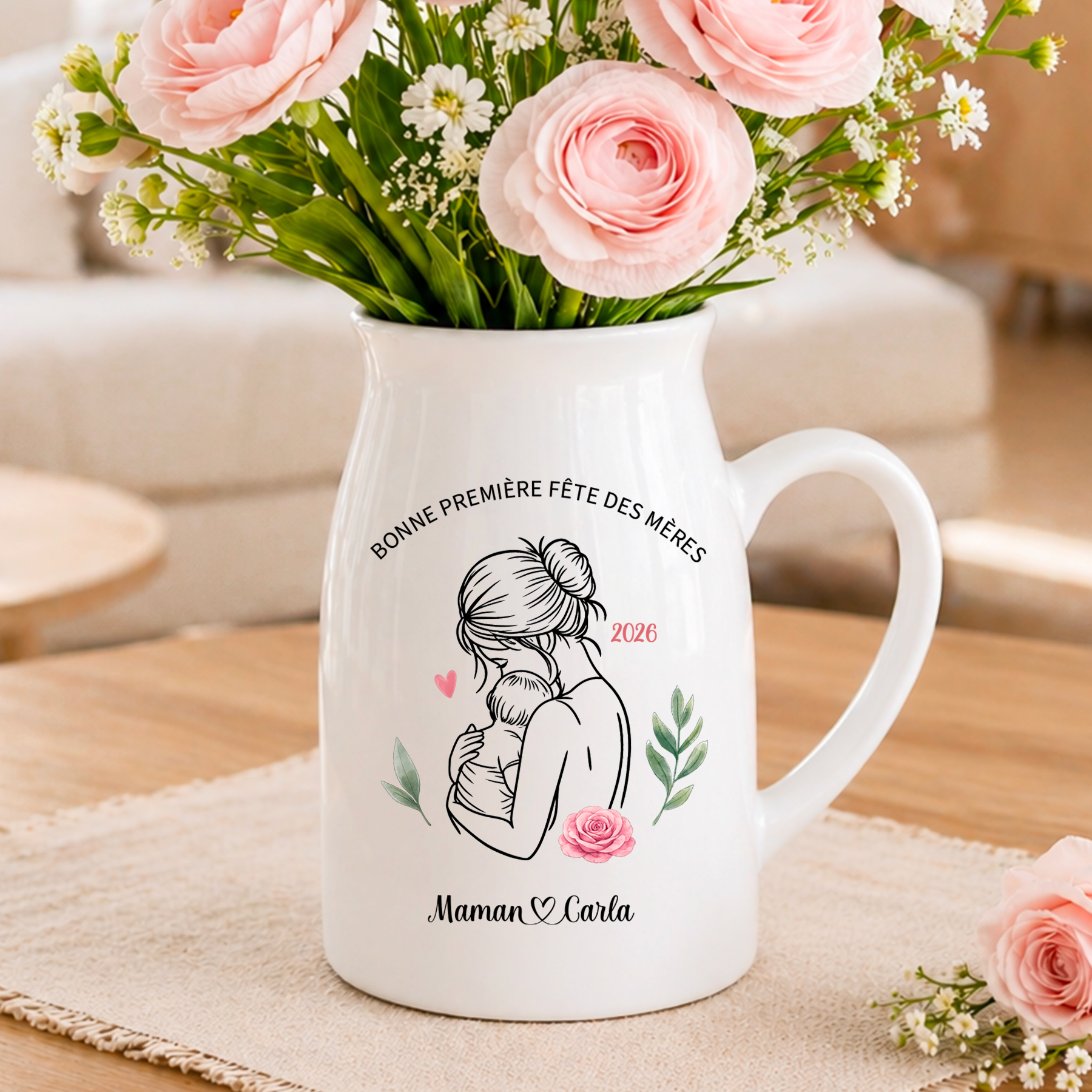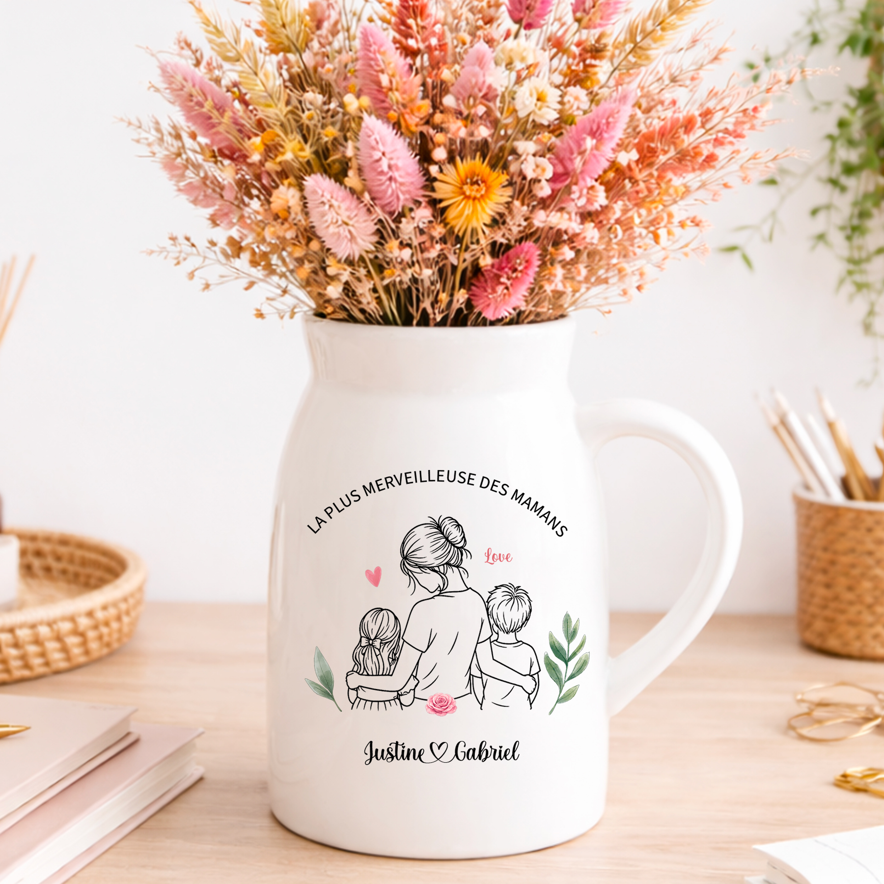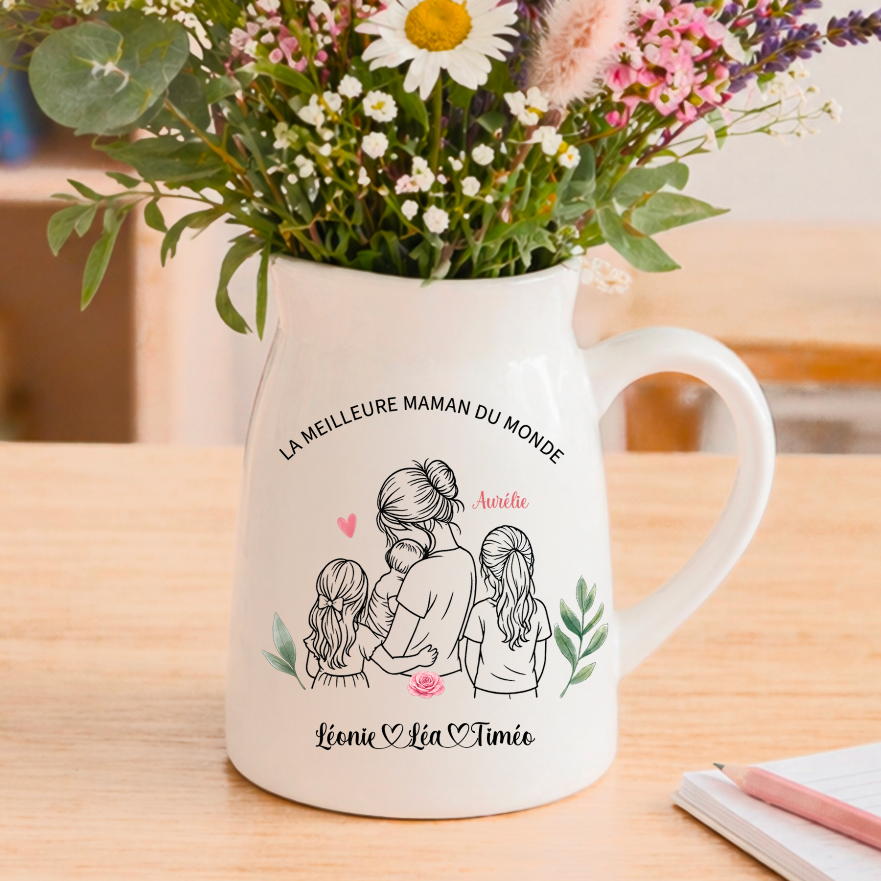 Personnalisez ce joli pot de fleurs avec une illustration tendre représentant une maman entourée de ses enfants. Choisissez la composition qui correspond à votre famille : maman avec 1 bébé, 2 enfants, 3 enfants… (jusqu’à 10 combinaisons possibles). Ajoutez les prénoms et un message de votre choix pour créer un souvenir vraiment unique 💛