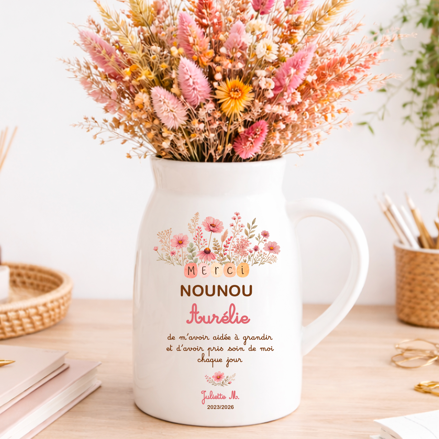 Personnalisez ce joli pot de fleurs avec le prénom de l’enseignant(e), celui de l’enfant, ainsi que le message de votre choix comme :« Merci de m’avoir appris plein de choses cette année » Ce vase style pot à lait, à la fois simple et élégant, est parfait pour accueillir des fleurs fraîches ou séchées. Un souvenir unique qui fera plaisir à coup sûr et qui pourra être conservé longtemps 💐