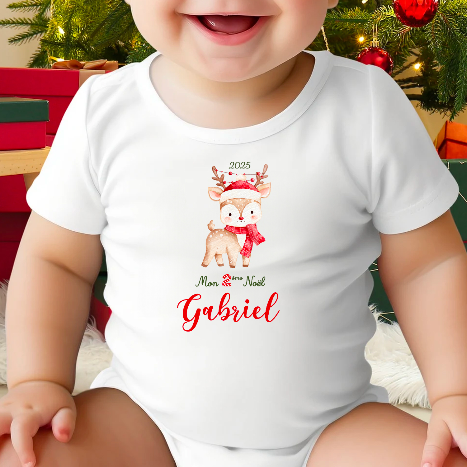 Craquez pour notre t-shirt ou body personnalisé “Mon premier Noël”, “Mon deuxième Noël” ou “Joyeux Noël” 🦌