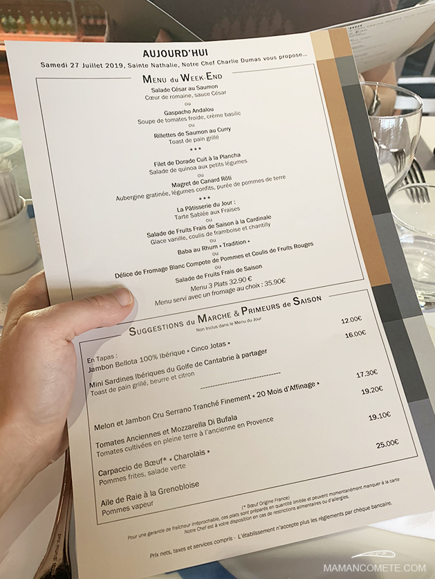 Mon avis : J’ai vraiment adoré ce restaurant, de l’ambiance, le petit apéritif, le semainier avec 3 choix à chaque plat et les plats en eux-même. C’était délicieux et très copieux ! Le vin n’est pas donné mais c’est le meilleur que j’ai jamais goûté : léger, fruité et sucré. En plus le restaurant est “kid-friendly”, un menu enfant est proposé avec une petite box surprise pour l’occuper. On amènera peut-être Fiona la prochaine fois 🙂