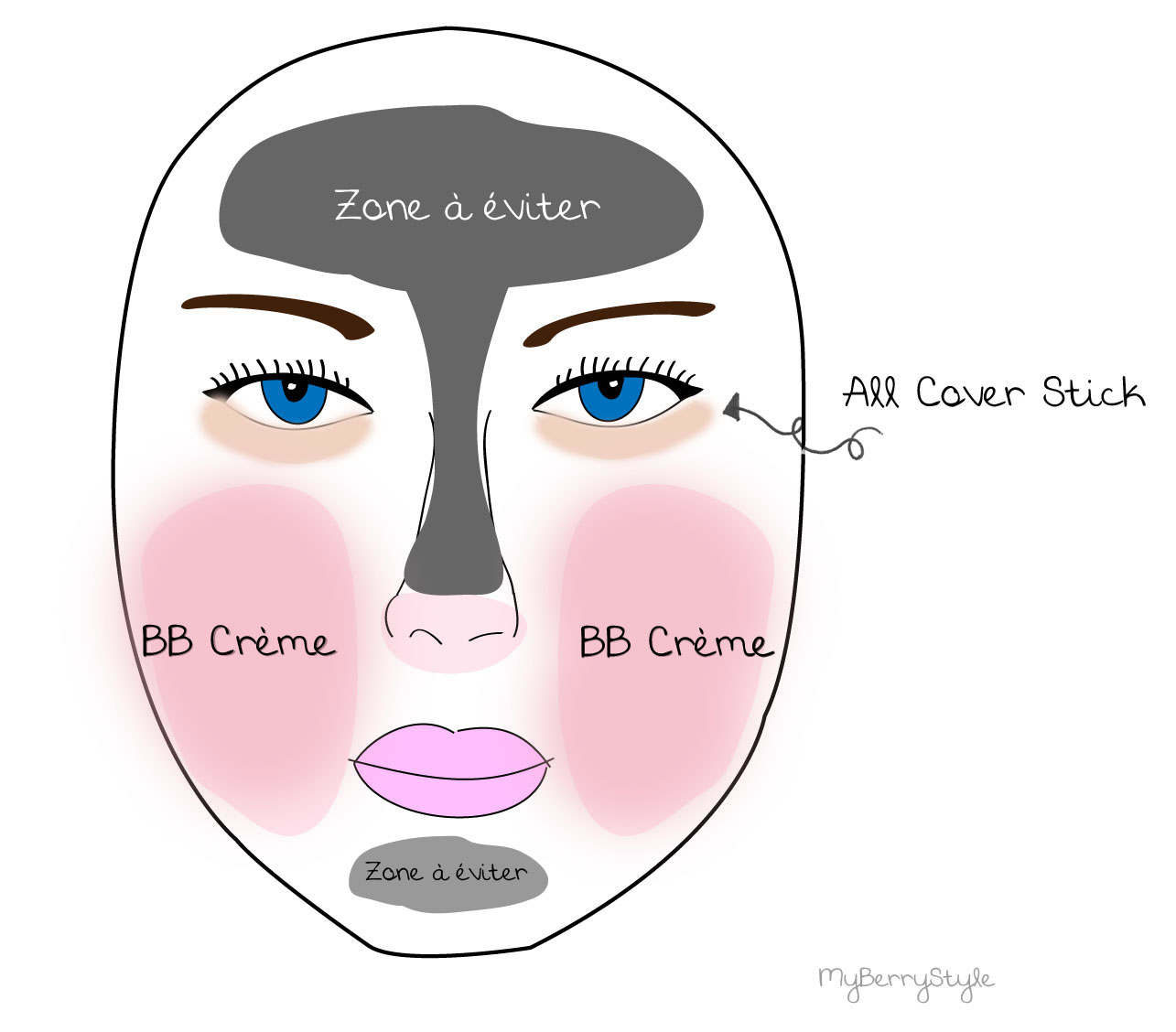 J’applique la BB crème sur mes joues, le coté du menton et les tempes mais j’évite la zone T et le menton.